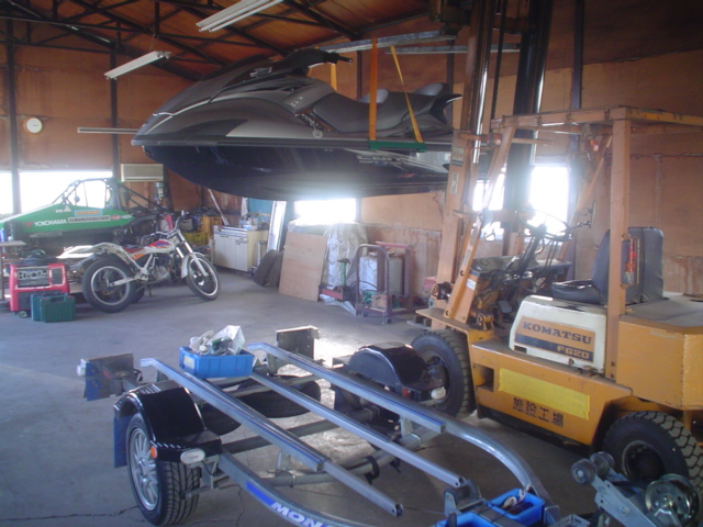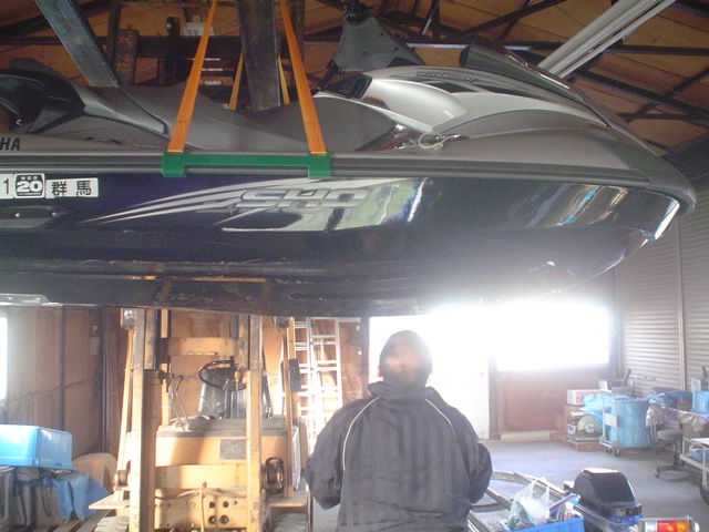 ジェットの船底修理、吊り上げ専用工具使用して